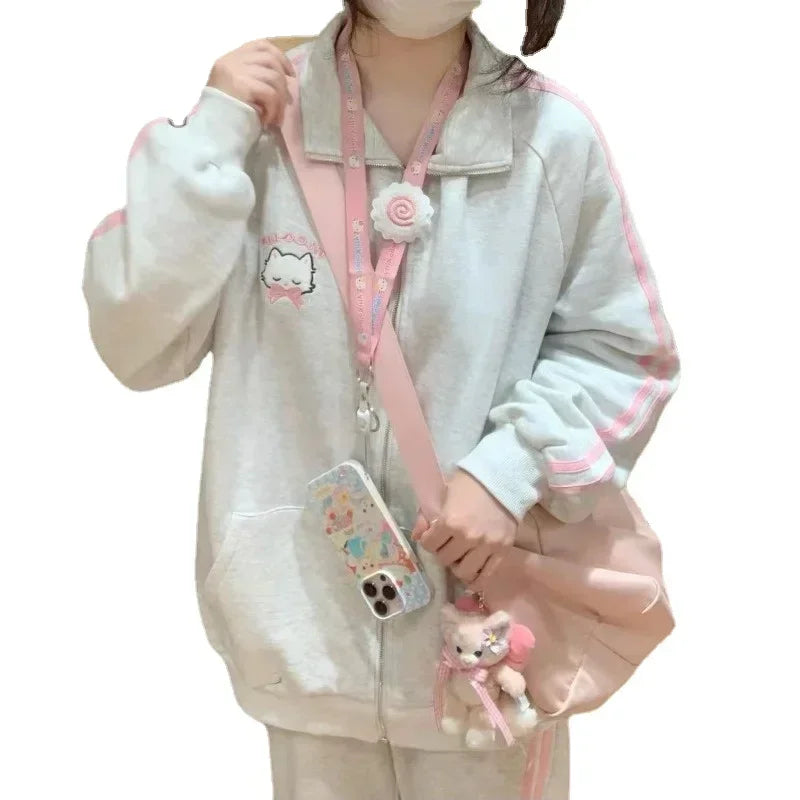 Cute oversized hoodie with kawaii pink cat embroidery. Features a zipper design and cozy fit, perfect for Japanese fashion lovers.